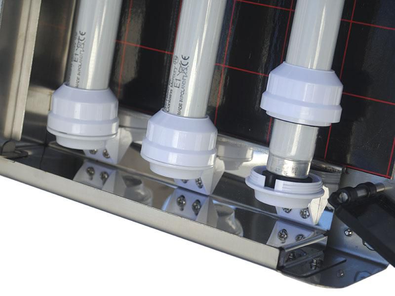 Su diseño innovador de 100 % acero inoxidable como sus sócalos de plástico de alto impacto con orines de goma en su interior y tres potentes tubos UV de 15 vatios incorporados brindan un poder de atracción más fuerte para los insectos voladores